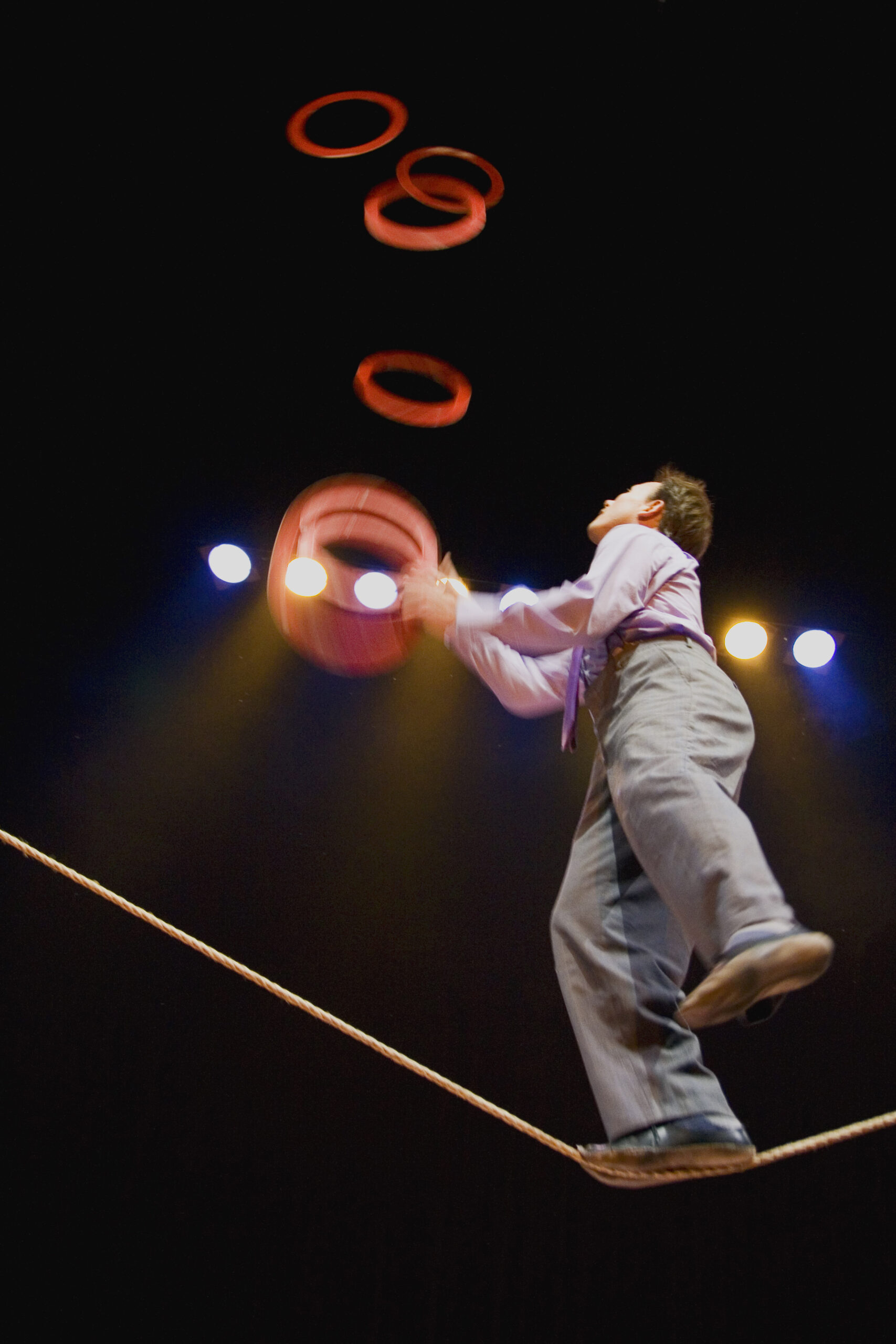 A story told with touching humor, witty tomfoolery, and no hi-tech distractions, Adkins’ acrobatic exploits astound the audience with only sounds and gestures as he performs both on the ground and on the slack rope! Adkins transforms the trivial into the extraordinary to create a new fantastic tale in this unforgettable, moving, and hilarious show.