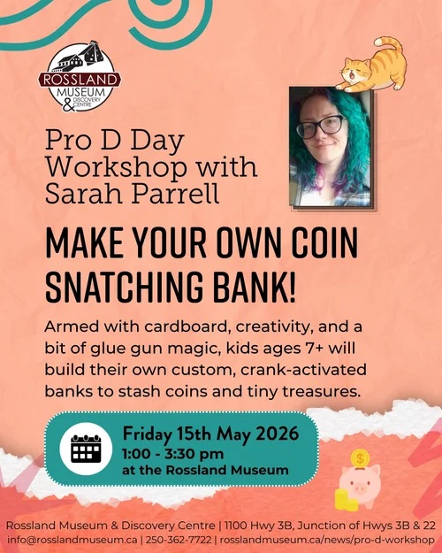 Join guest artist Sarah Parrell for a special Pro D Day workshop to create your very own custom DIY Coin Snatching Bank! Armed with cardboard, creativity, and a bit of glue gun magic, kids will build their own custom, crank-activated banks to stash coins and tiny treasures. This workshop is available to youth ages 7+ and spots are limited, so don’t wait to reserve your spot!